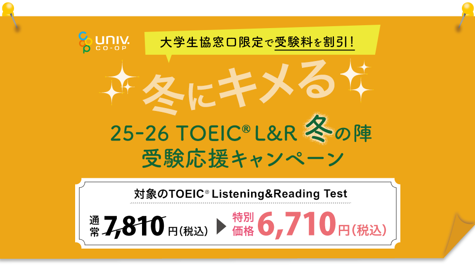 あまり知られていないと思いますが、期間限定で大学生協窓口で申し込める「TOEIC受験応援キャンペーン」が行わるときがあります。