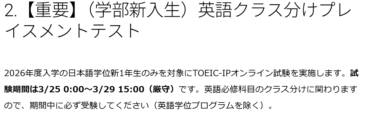 理工学学術院のGuidanceサイトに、プレイスメントテストに関する大まかな情報が載っています👇